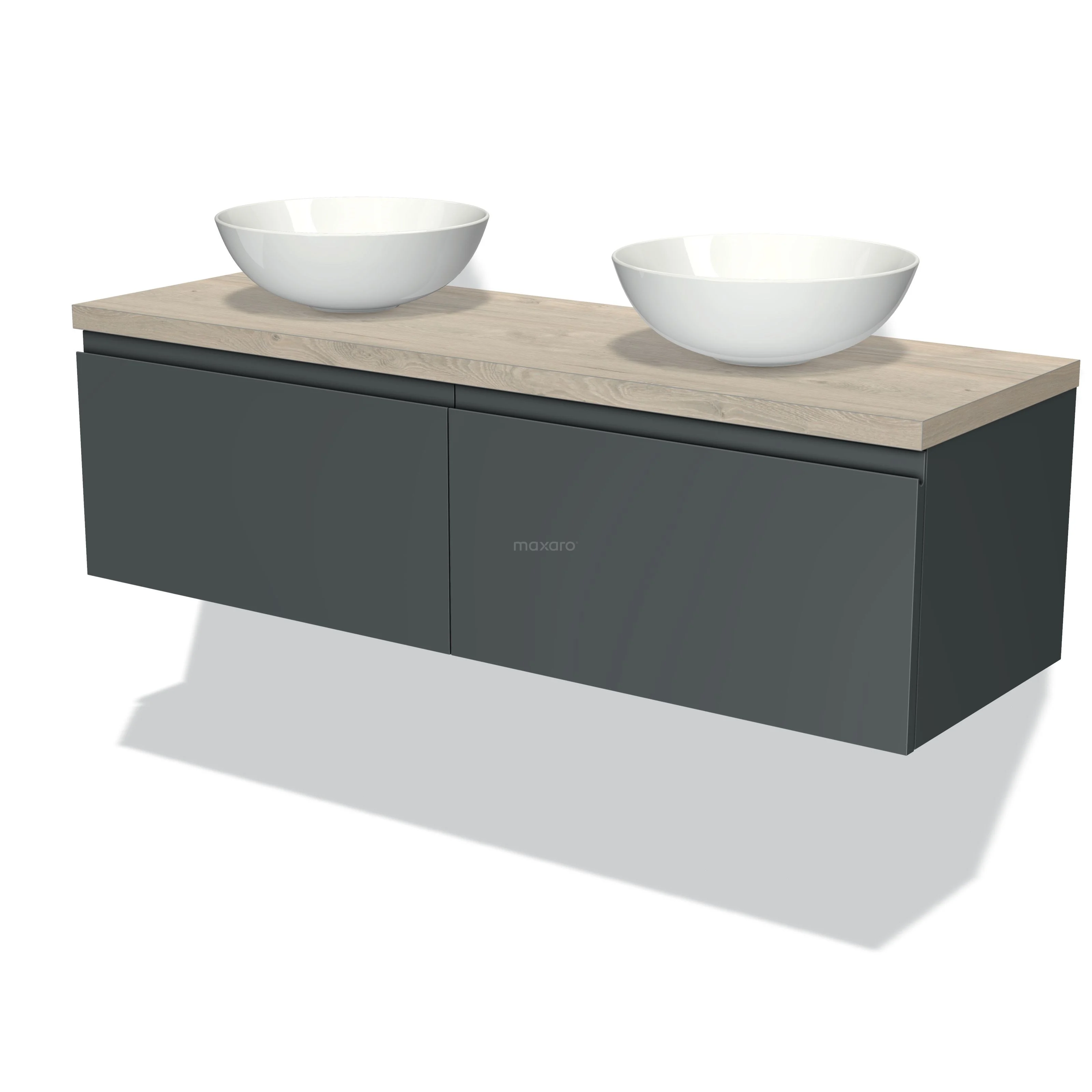 Modulo Plato Badmöbel mit Aufsatzwaschbecken | 140 cm Dunkelgrau Grifflos front Hellgraue Eiche blatt 2 nebeneinanderliegende Schubladen
