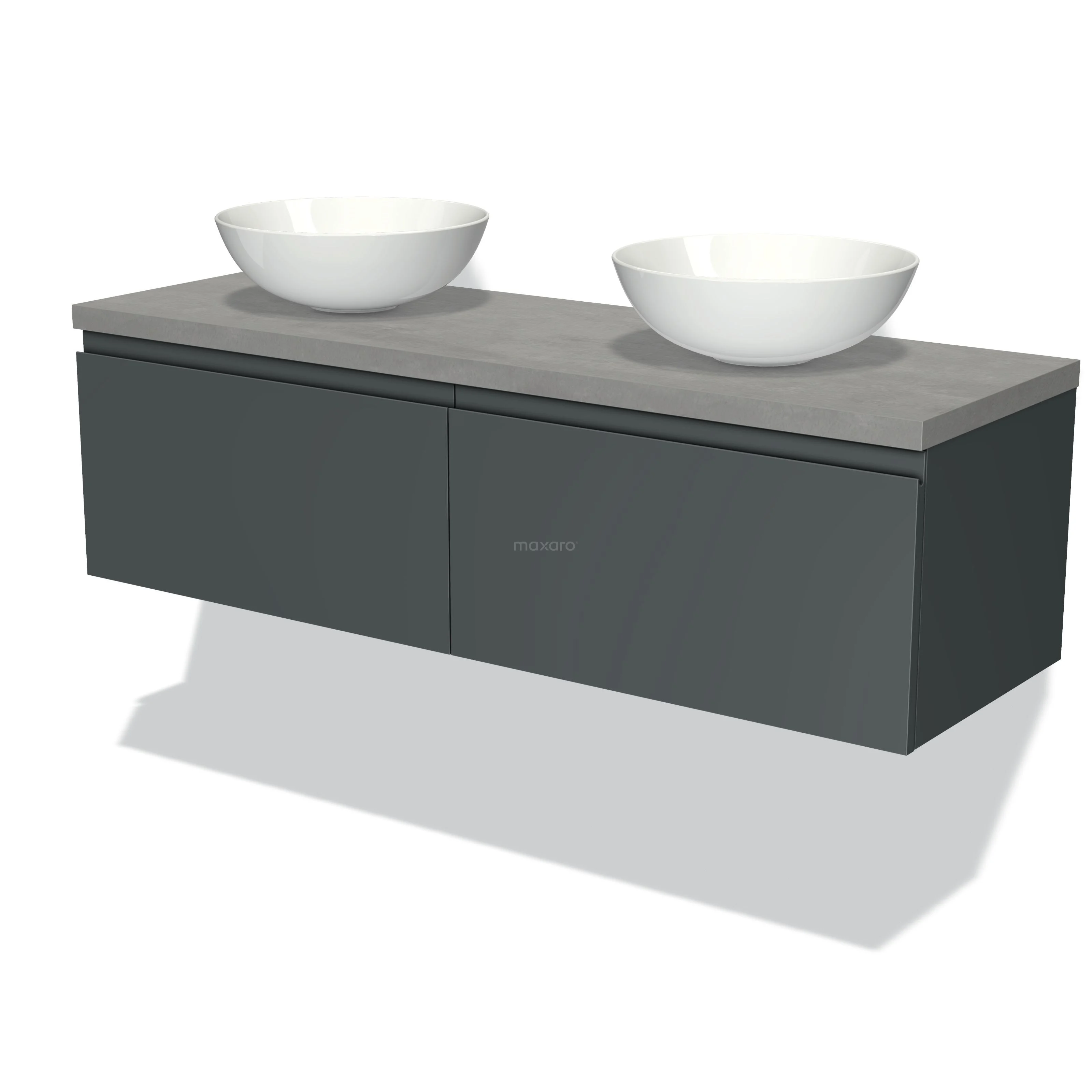 Modulo Plato Badmöbel mit Aufsatzwaschbecken | 140 cm Dunkelgrau Grifflos front Hellgrauer Beton blatt 2 nebeneinanderliegende Schubladen