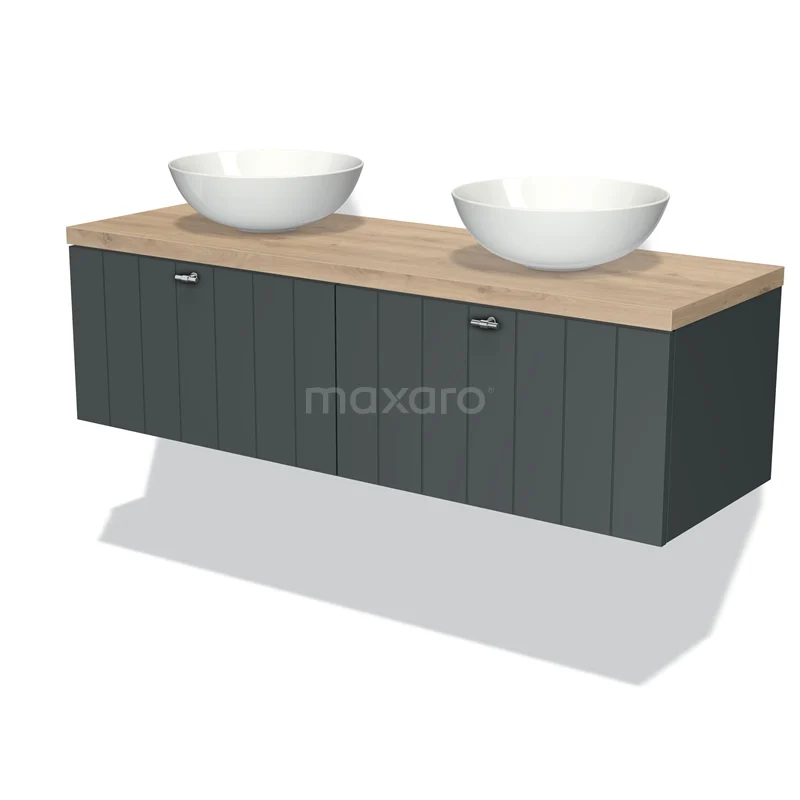 Modulo Plato Badmöbel mit Aufsatzwaschbecken | 140 cm Dunkelgrau Lamelle front Hellbraune Eiche blatt 2 nebeneinanderliegende Schubladen