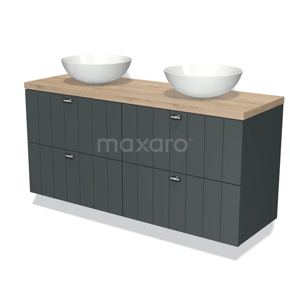 Modulo Plato Badmöbel mit Aufsatzwaschbecken | 140 cm Dunkelgrau Lamelle front Hellbraune Eiche blatt 4 Schubladen