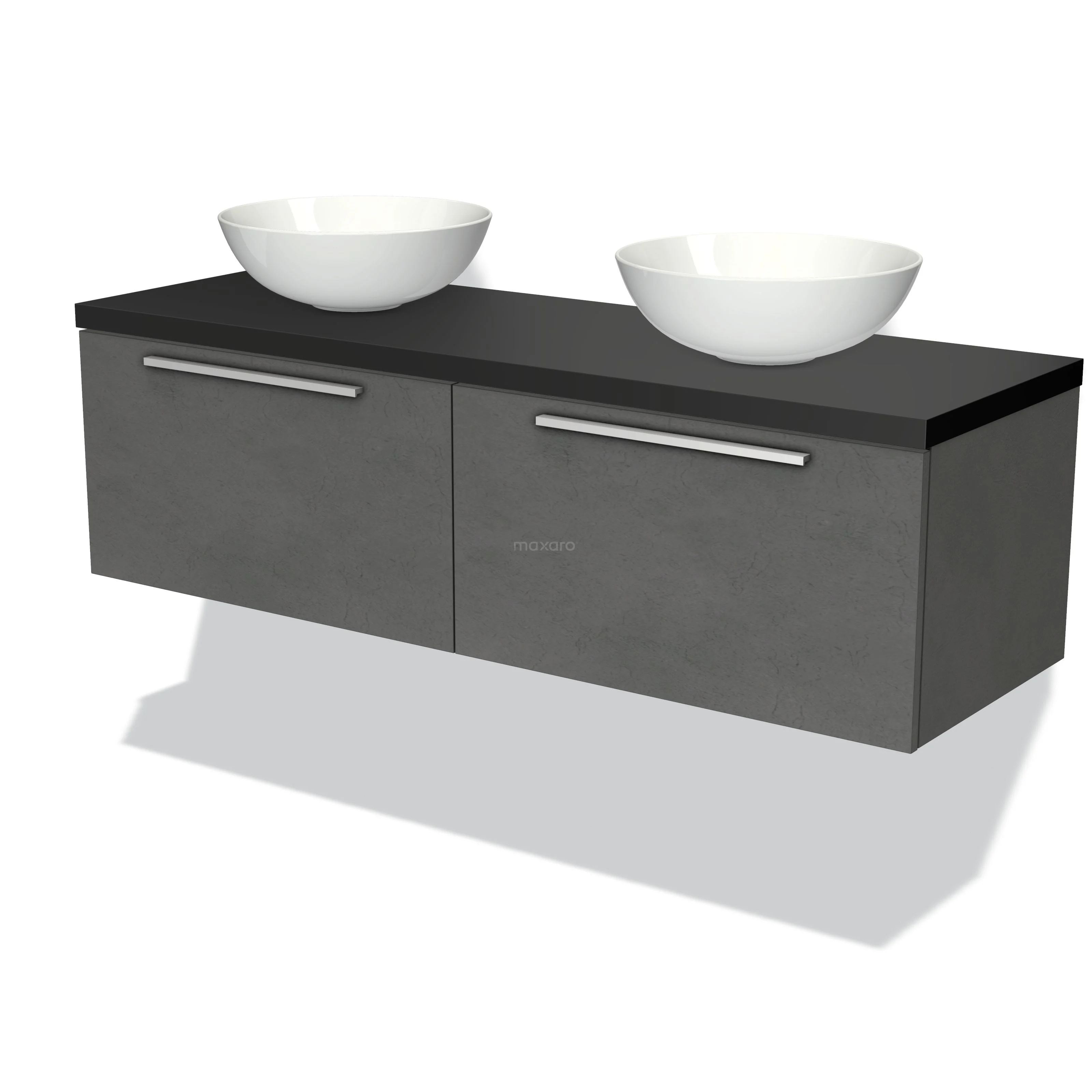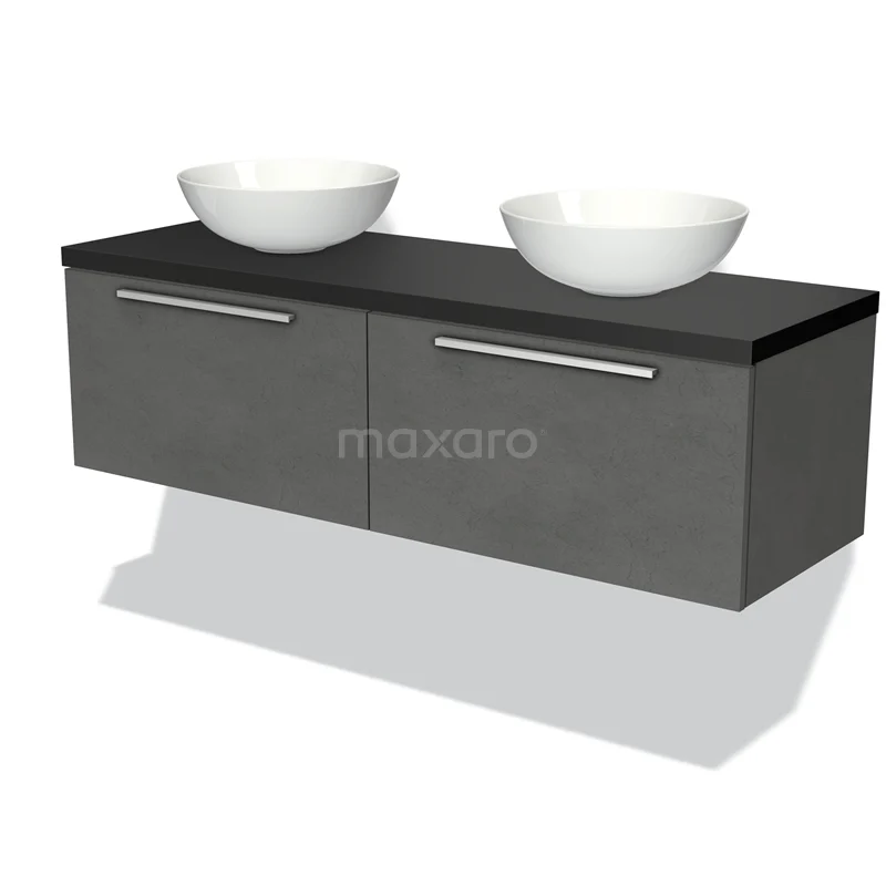 Modulo Plato Badmöbel mit Aufsatzwaschbecken | 140 cm Dunkelgrauer Beton Flach front Matt Schwarz blatt 2 nebeneinanderliegende Schubladen
