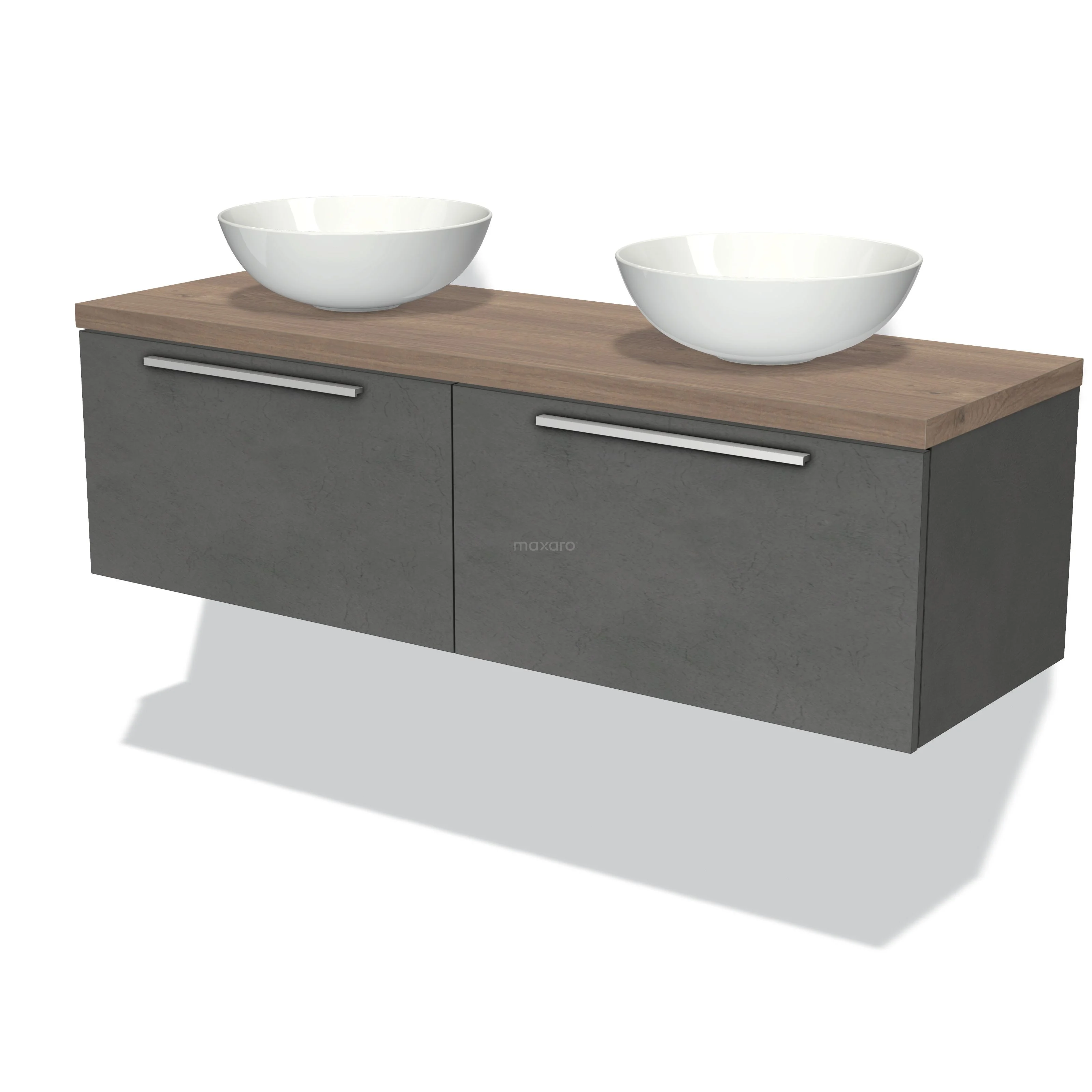 Modulo Plato Badmöbel mit Aufsatzwaschbecken | 140 cm Dunkelgrauer Beton Flach front Mittelbraune Eiche blatt 2 nebeneinanderliegende Schubladen