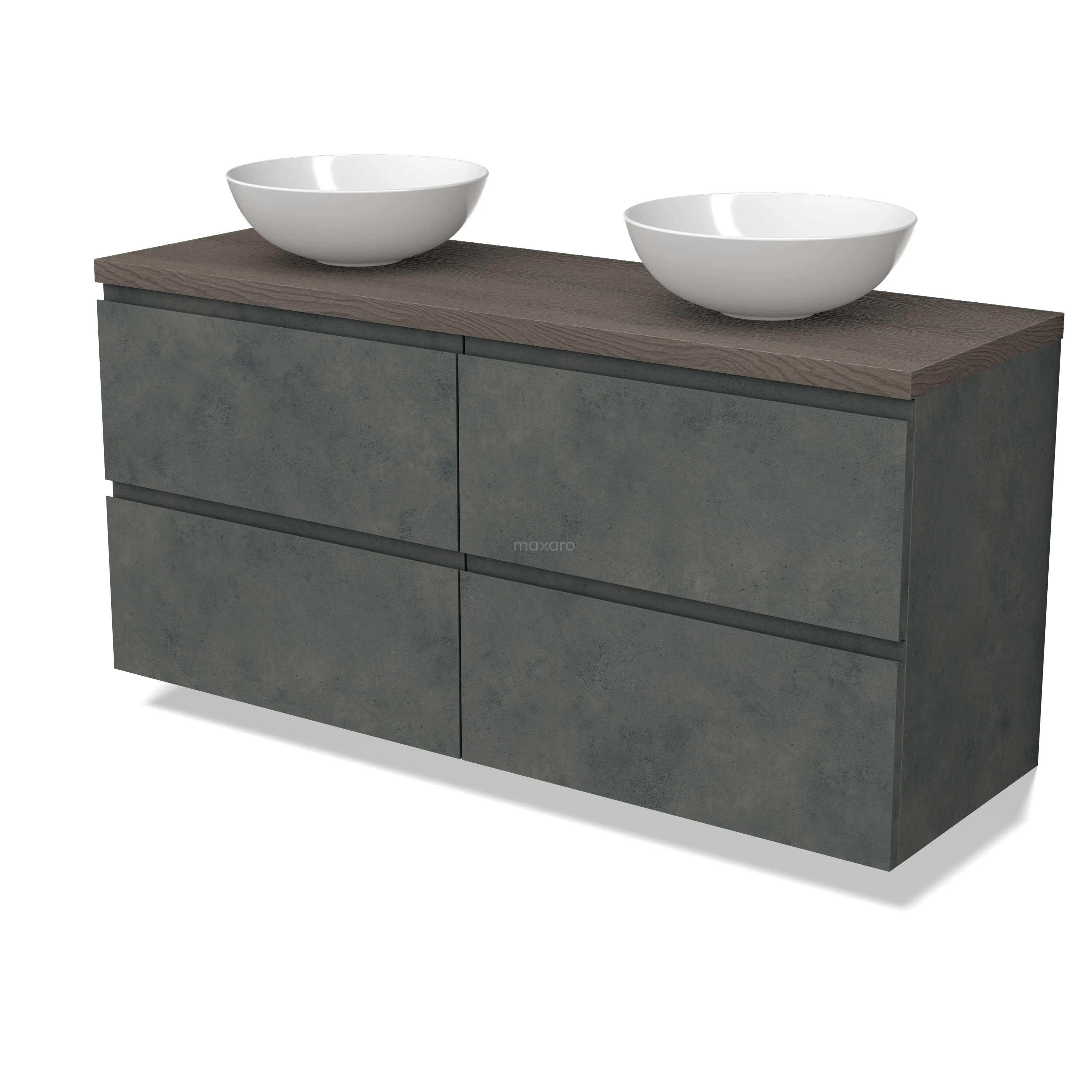 Modulo Plato Badmöbel mit Aufsatzwaschbecken | 140 cm Dunkelgrauer Beton Grifflos front Dunkelbraune Eiche blatt 4 Schubladen