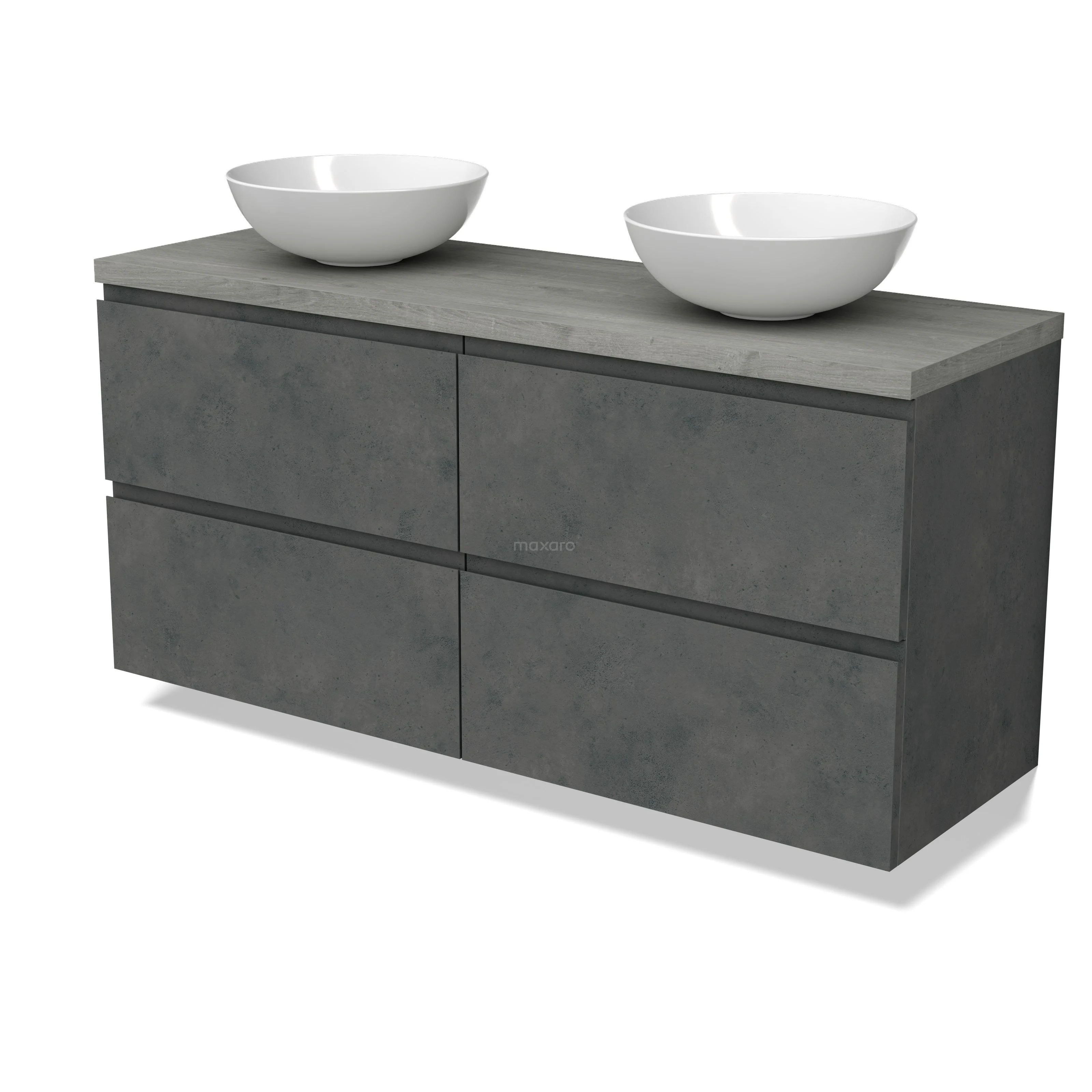 Modulo Plato Badmöbel mit Aufsatzwaschbecken | 140 cm Dunkelgrauer Beton Grifflos front Graue Eiche blatt 4 Schubladen
