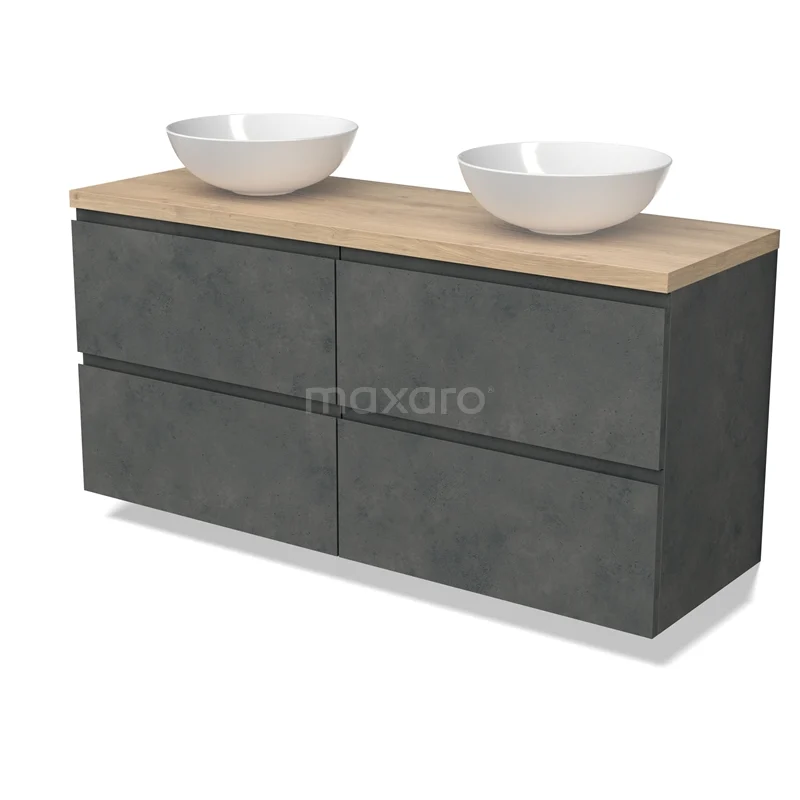 Modulo Plato Badmöbel mit Aufsatzwaschbecken | 140 cm Dunkelgrauer Beton Grifflos front Hellbraune Eiche blatt 4 Schubladen