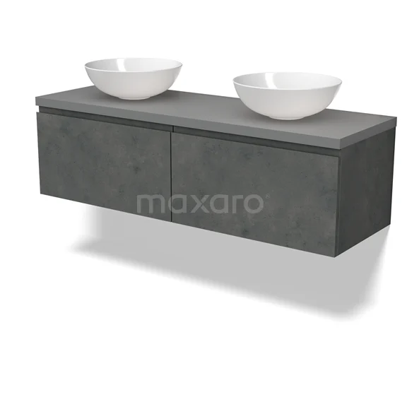 Modulo Plato Badmöbel mit Aufsatzwaschbecken | 140 cm Dunkelgrauer Beton Grifflos front Mittelgrau blatt 2 nebeneinanderliegende Schubladen