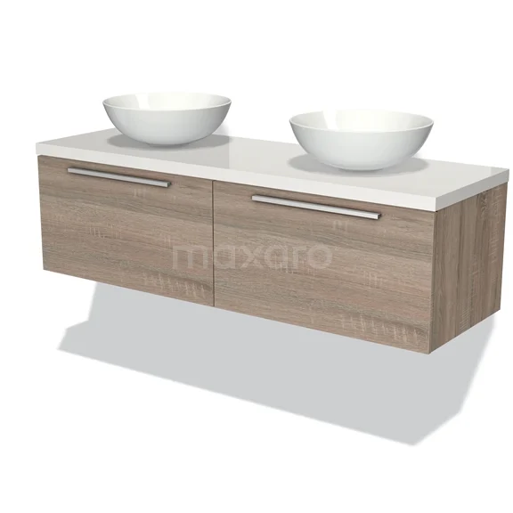 Modulo Plato Badmöbel mit Aufsatzwaschbecken | 140 cm Eiche Flach front Hochglanz Weiß blatt 2 nebeneinanderliegende Schubladen
