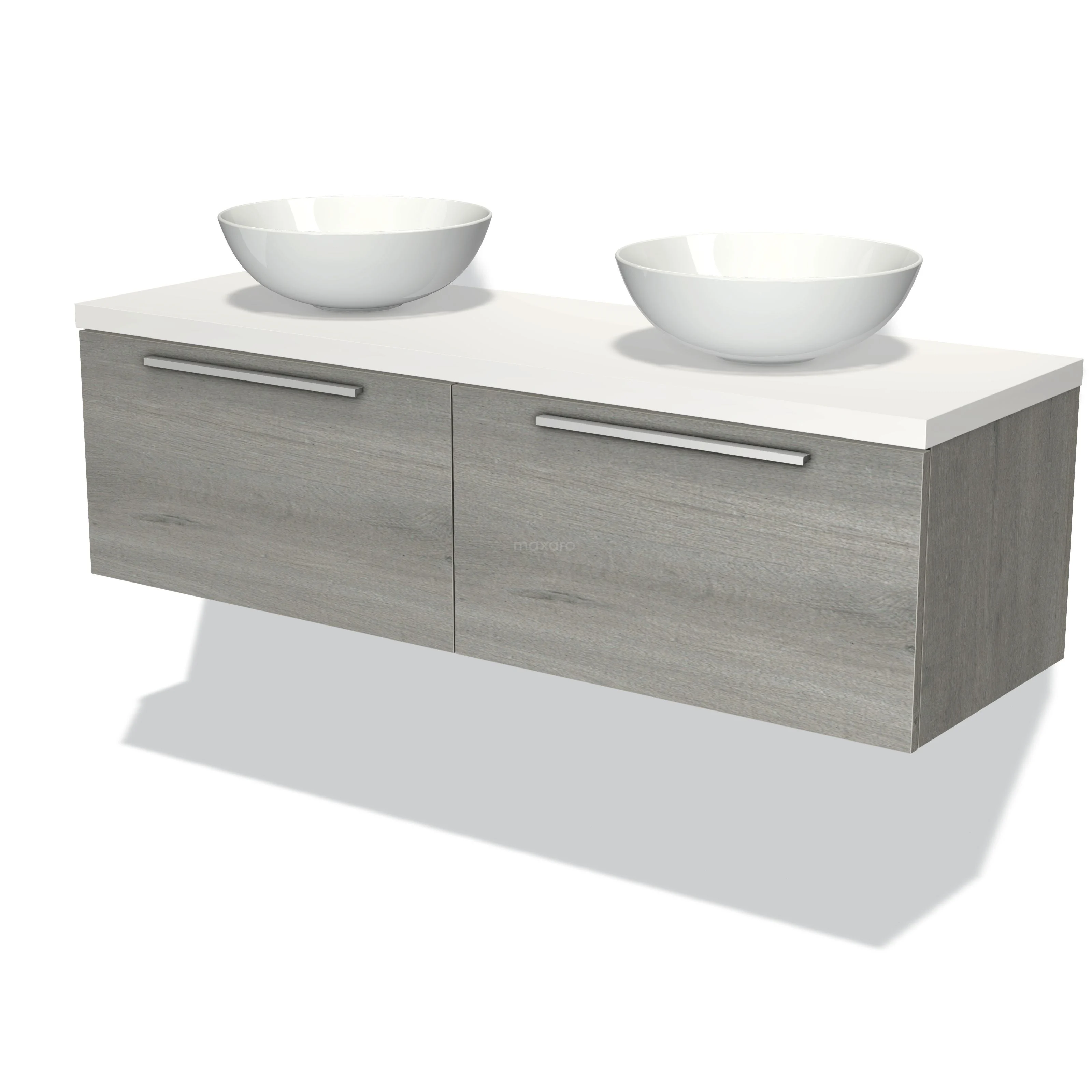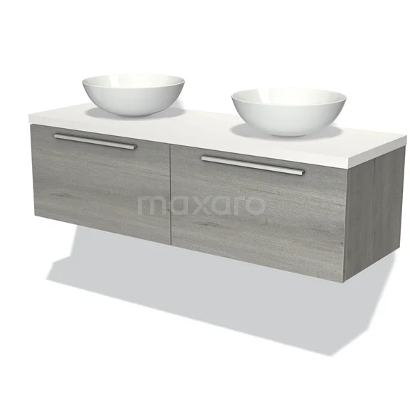Modulo Plato Badmöbel mit Aufsatzwaschbecken | 140 cm Graue Eiche Flach front Matt Weiß blatt 2 nebeneinanderliegende Schubladen