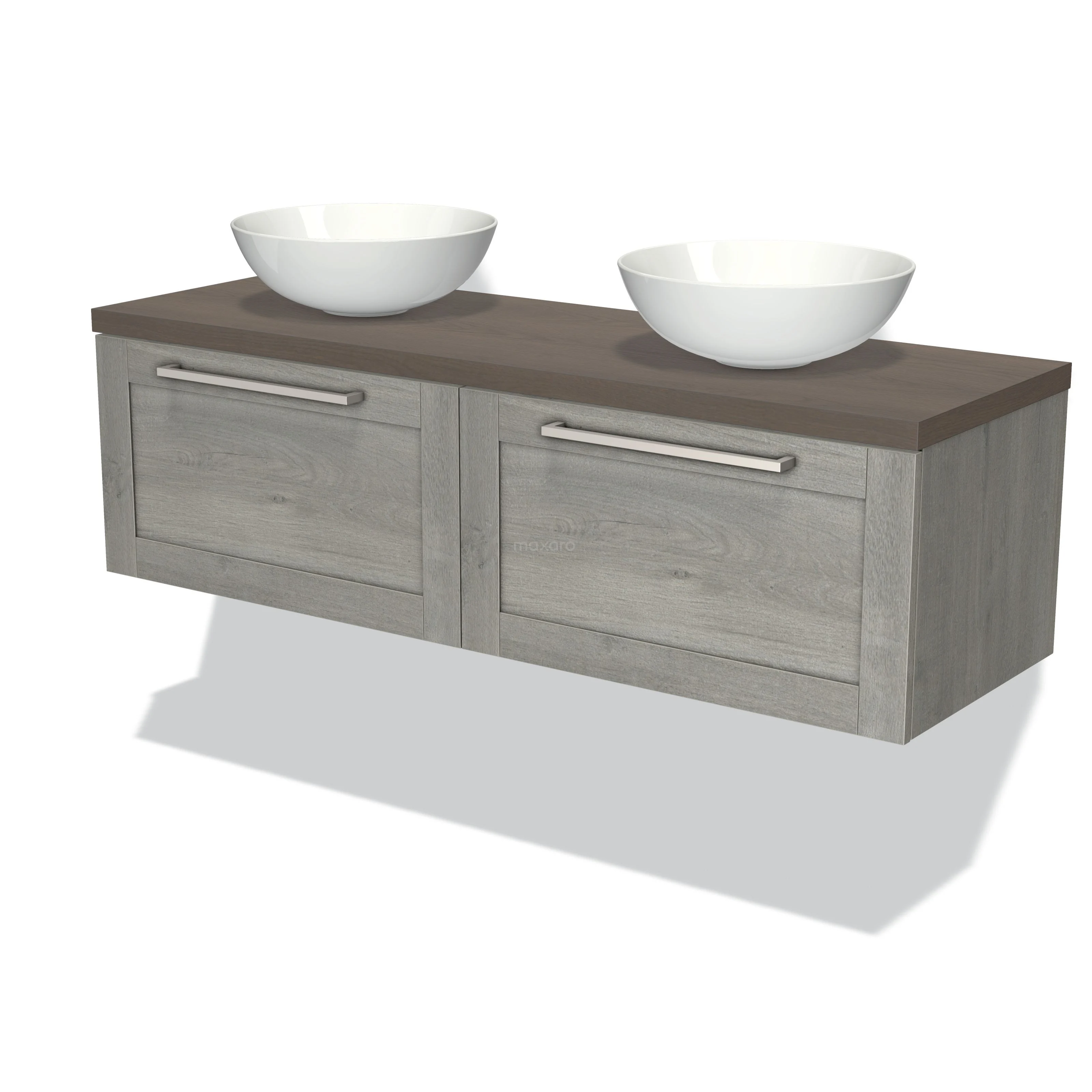Modulo Plato Badmöbel mit Aufsatzwaschbecken | 140 cm Graue Eiche Rahmen front Dunkelbraune Eiche blatt 2 nebeneinanderliegende Schubladen