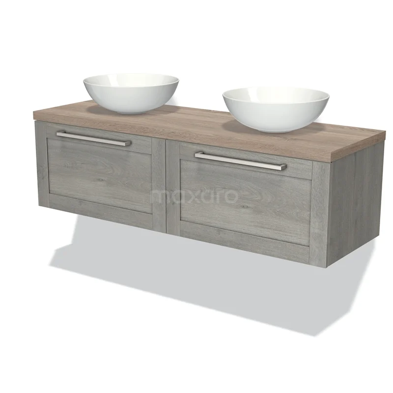 Modulo Plato Badmöbel mit Aufsatzwaschbecken | 140 cm Graue Eiche Rahmen front Eiche blatt 2 nebeneinanderliegende Schubladen