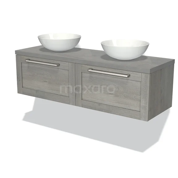 Modulo Plato Badmöbel mit Aufsatzwaschbecken | 140 cm Graue Eiche Rahmen front Hellgrauer Beton blatt 2 nebeneinanderliegende Schubladen