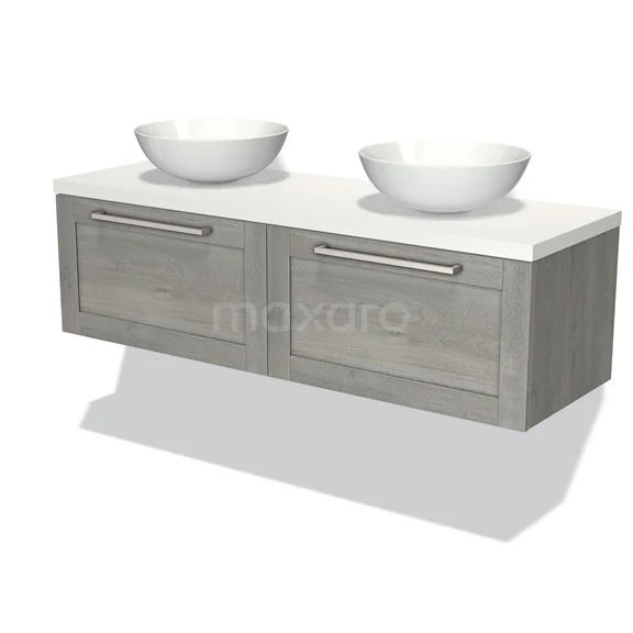 Modulo Plato Badmöbel mit Aufsatzwaschbecken | 140 cm Graue Eiche Rahmen front Matt Weiß blatt 2 nebeneinanderliegende Schubladen