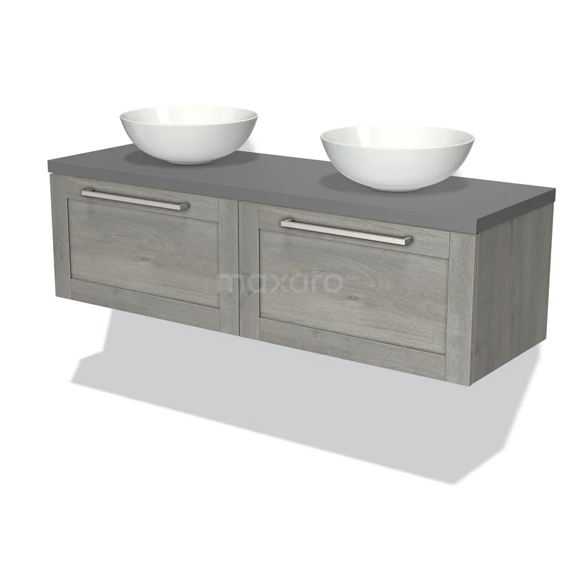 Modulo Plato Badmöbel mit Aufsatzwaschbecken | 140 cm Graue Eiche Rahmen front Mittelgrau blatt 2 nebeneinanderliegende Schubladen