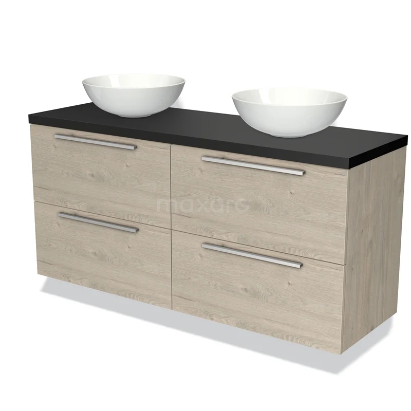 Modulo Plato Badmöbel mit Aufsatzwaschbecken | 140 cm Hellgraue Eiche Flach front Matt Schwarz blatt 4 Schubladen