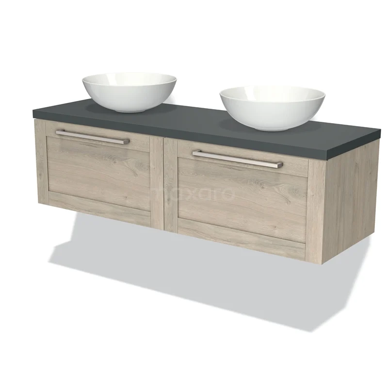 Modulo Plato Badmöbel mit Aufsatzwaschbecken | 140 cm Hellgraue Eiche Rahmen front Dunkelgrau blatt 2 nebeneinanderliegende Schubladen