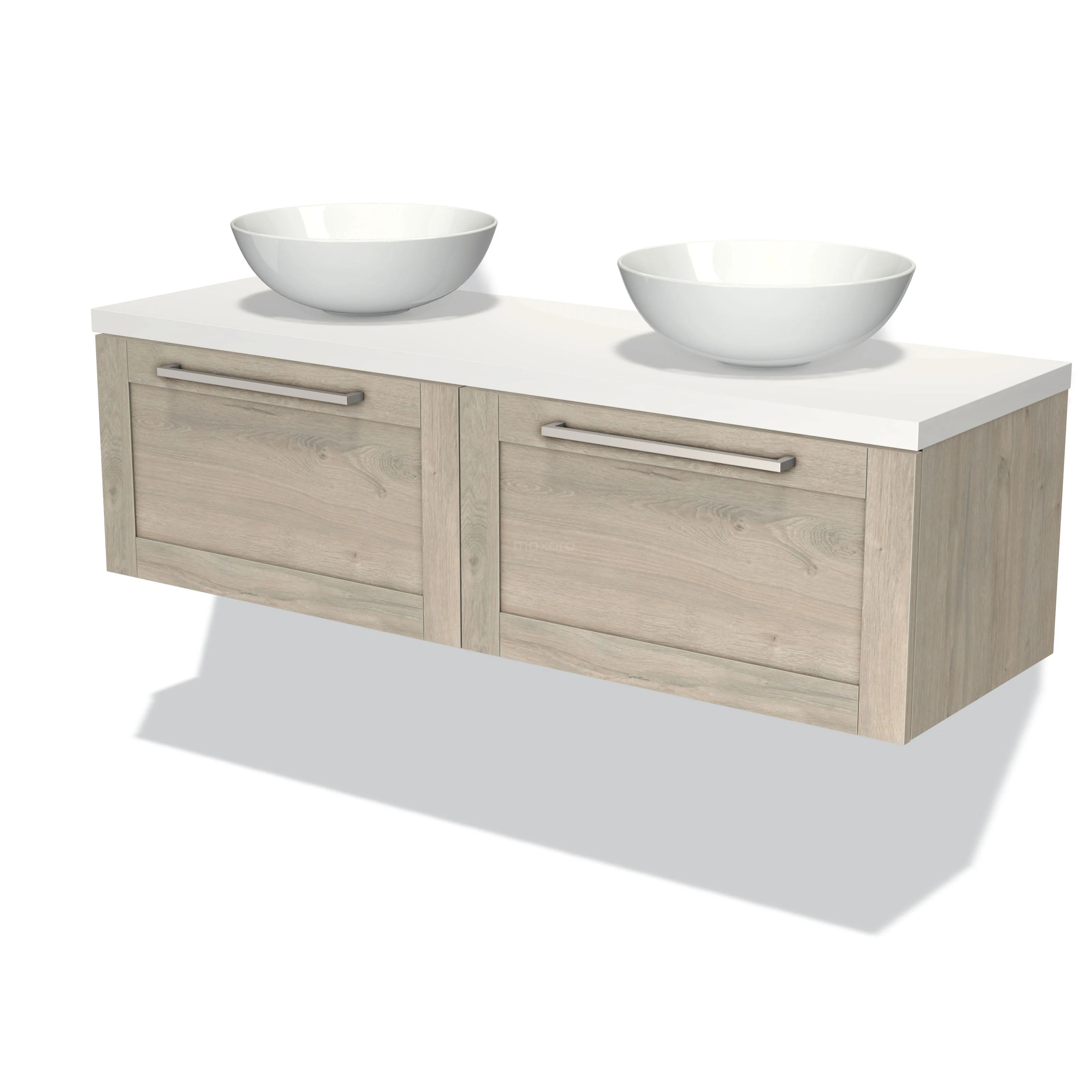 Modulo Plato Badmöbel mit Aufsatzwaschbecken | 140 cm Hellgraue Eiche Rahmen front Matt Weiß blatt 2 nebeneinanderliegende Schubladen