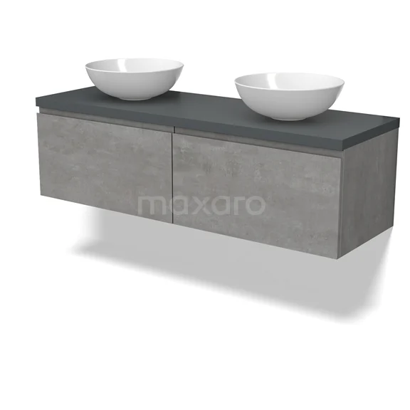 Modulo Plato Badmöbel mit Aufsatzwaschbecken | 140 cm Hellgrauer Beton Grifflos front Dunkelgrau blatt 2 nebeneinanderliegende Schubladen