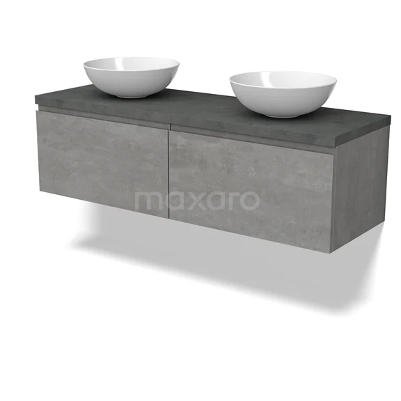 Modulo Plato Badmöbel mit Aufsatzwaschbecken | 140 cm Hellgrauer Beton Grifflos front Dunkelgrauer Beton blatt 2 nebeneinanderliegende Schubladen