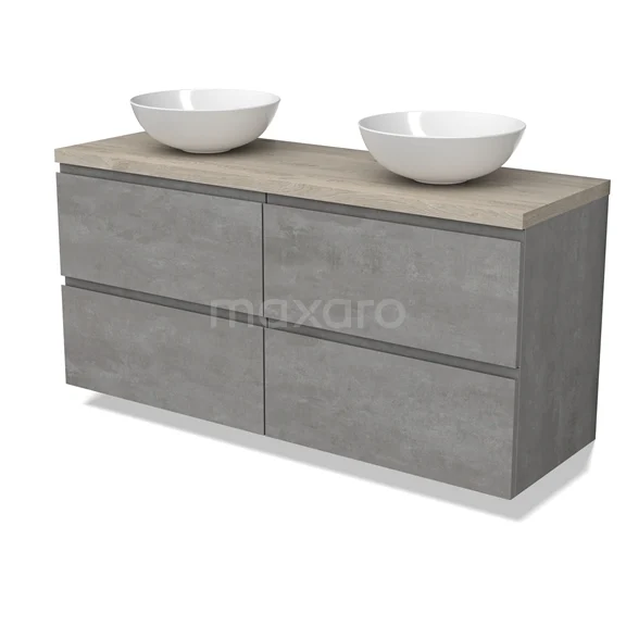 Modulo Plato Badmöbel mit Aufsatzwaschbecken | 140 cm Hellgrauer Beton Grifflos front Hellgraue Eiche blatt 4 Schubladen