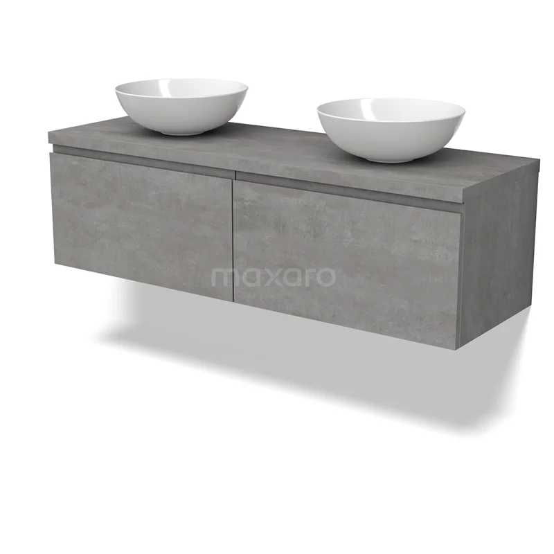 Modulo Plato Badmöbel mit Aufsatzwaschbecken | 140 cm Hellgrauer Beton Grifflos front Hellgrauer Beton blatt 2 nebeneinanderliegende Schubladen