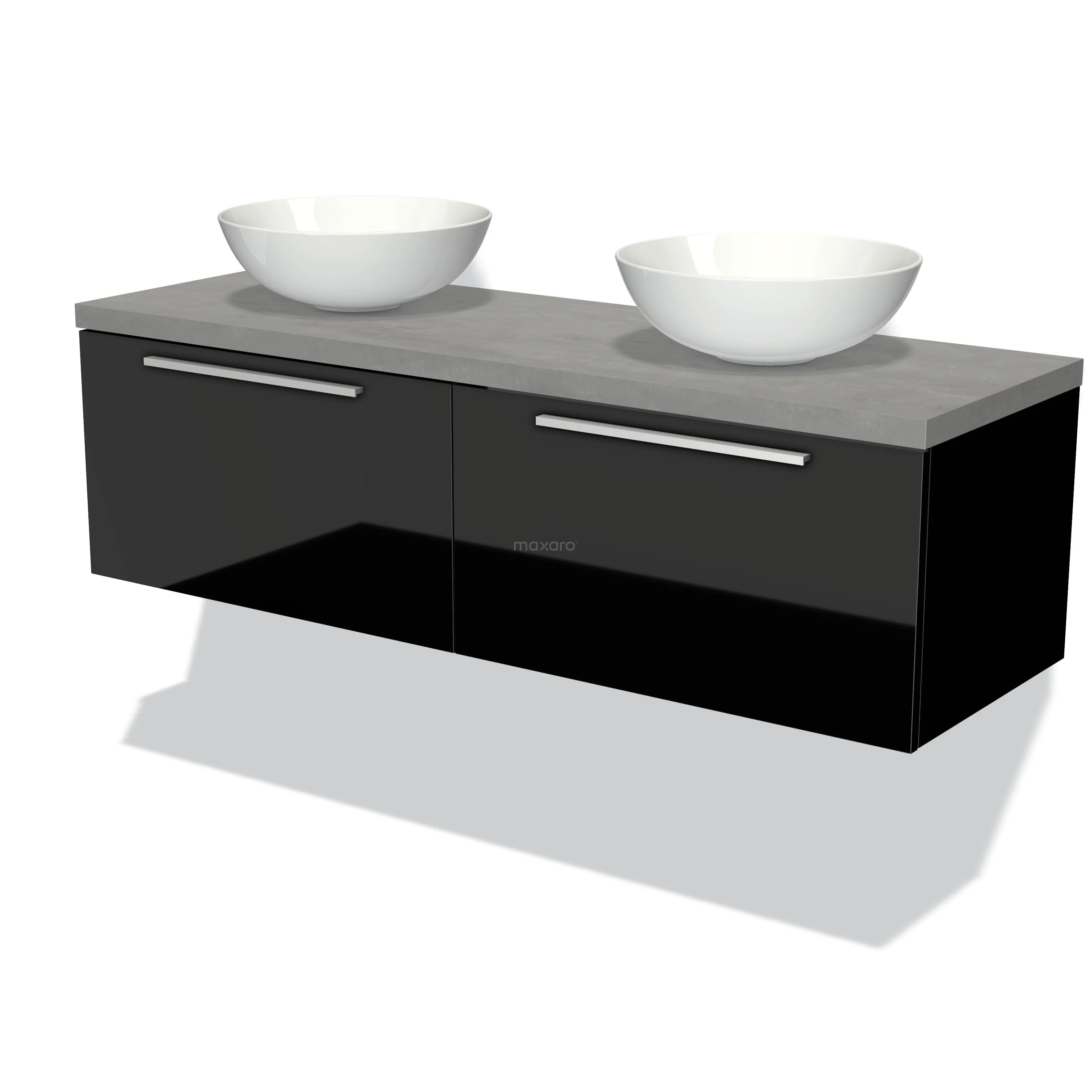 Modulo Plato Badmöbel mit Aufsatzwaschbecken | 140 cm Hochglanz Schwarz Flach front Hellgrauer Beton blatt 2 nebeneinanderliegende Schubladen