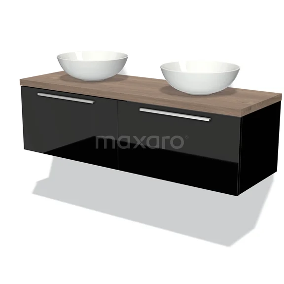 Modulo Plato Badmöbel mit Aufsatzwaschbecken | 140 cm Hochglanz Schwarz Flach front Mittelbraune Eiche blatt 2 nebeneinanderliegende Schubladen