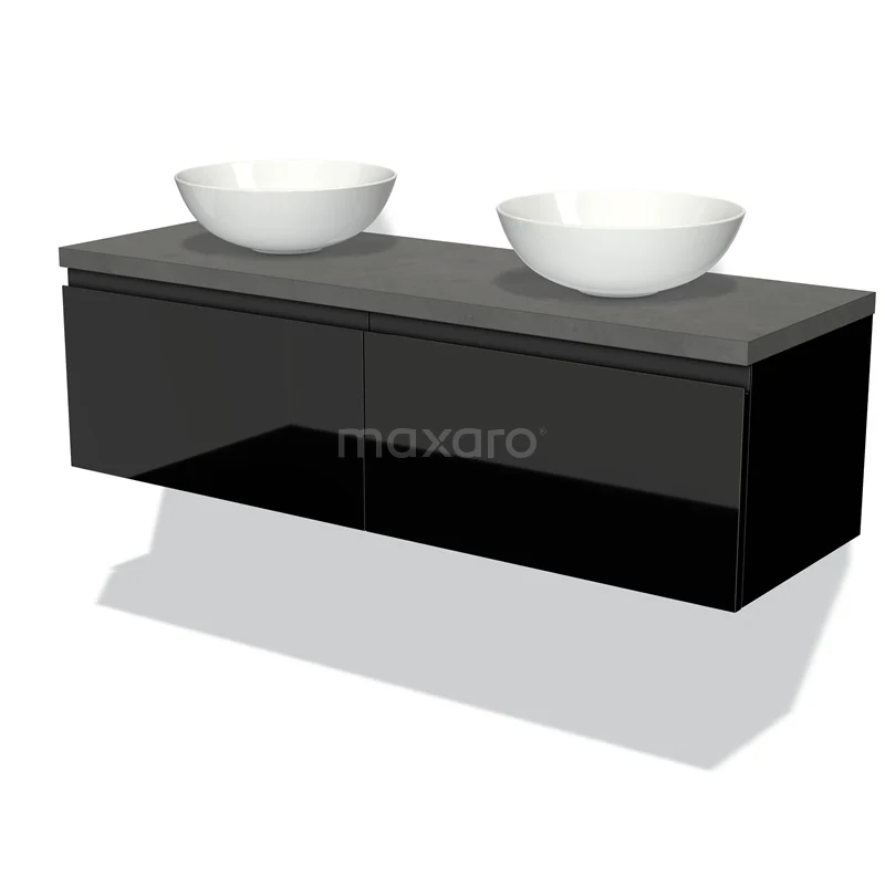 Modulo Plato Badmöbel mit Aufsatzwaschbecken | 140 cm Hochglanz Schwarz Grifflos front Dunkelgrauer Beton blatt 2 nebeneinanderliegende Schubladen