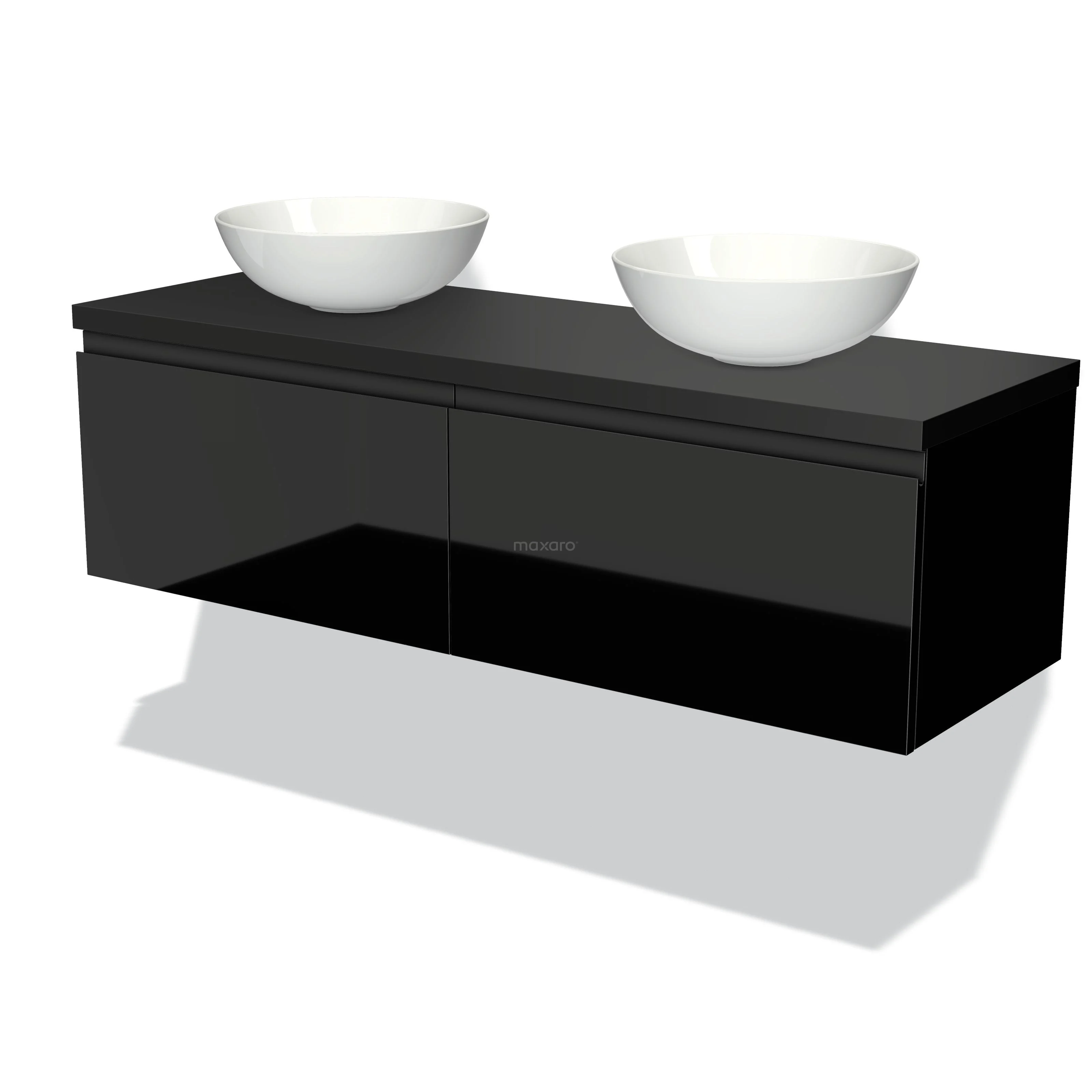Modulo Plato Badmöbel mit Aufsatzwaschbecken | 140 cm Hochglanz Schwarz Grifflos front Matt Schwarz blatt 2 nebeneinanderliegende Schubladen