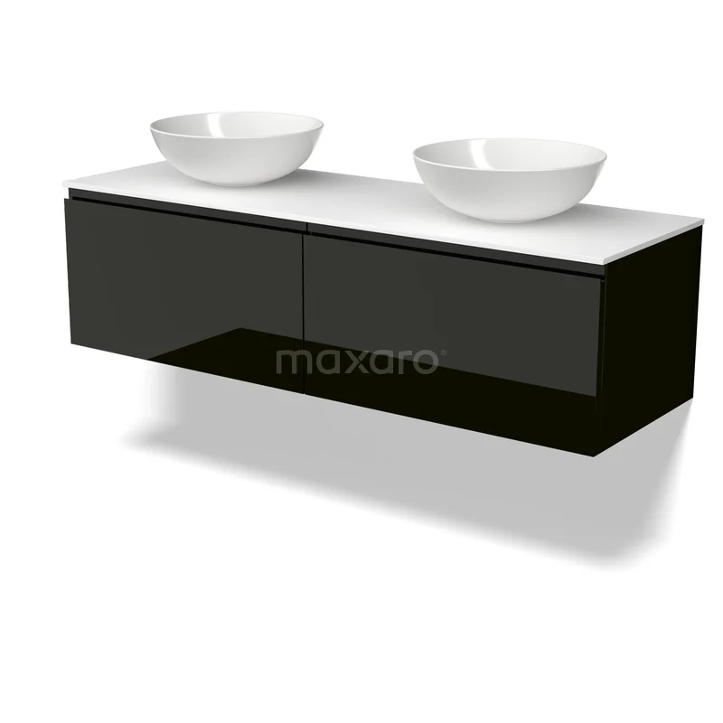 Modulo Plato Badmöbel mit Aufsatzwaschbecken | 140 cm Hochglanz Schwarz Grifflos front Solid Surface blatt 2 nebeneinanderliegende Schubladen