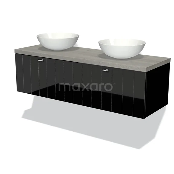 Modulo Plato Badmöbel mit Aufsatzwaschbecken | 140 cm Hochglanz Schwarz Lamelle front Graue Eiche blatt 2 nebeneinanderliegende Schubladen
