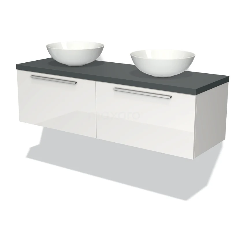 Modulo Plato Badmöbel mit Aufsatzwaschbecken | 140 cm Hochglanz Weiß Flach front Dunkelgrau blatt 2 nebeneinanderliegende Schubladen