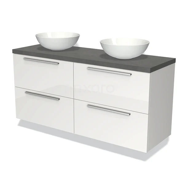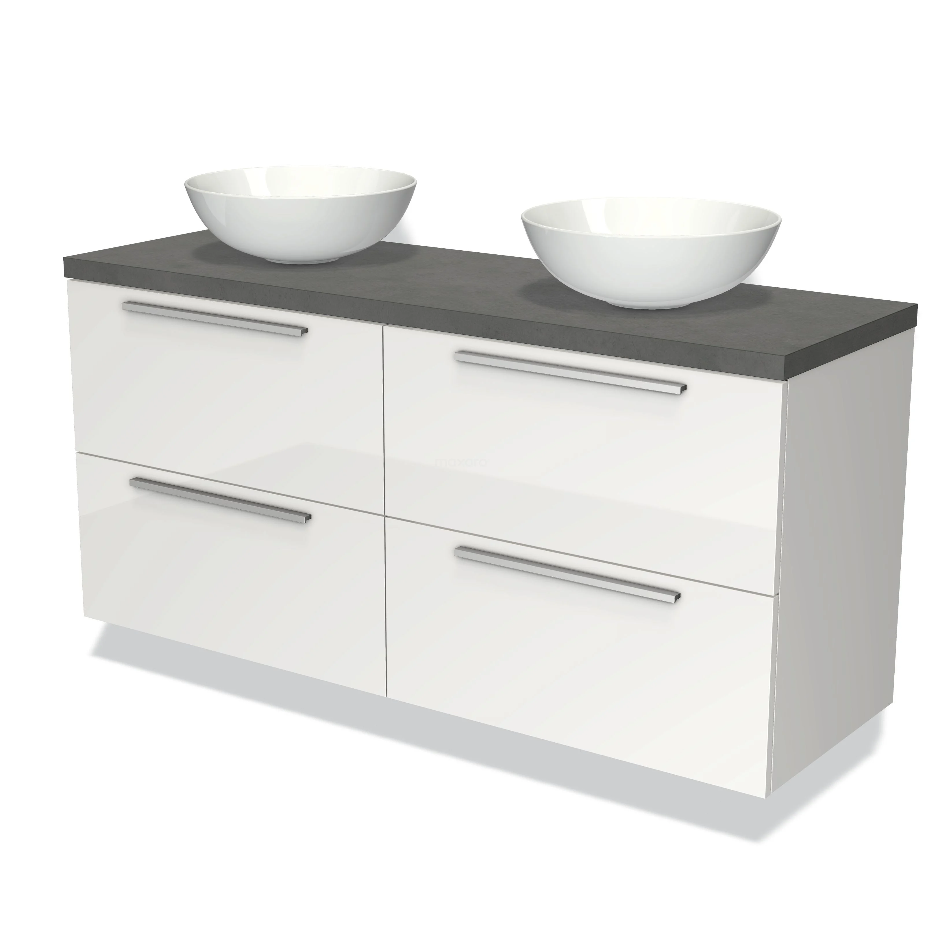 Modulo Plato Badmöbel mit Aufsatzwaschbecken | 140 cm Hochglanz Weiß Flach front Dunkelgrauer Beton blatt 4 Schubladen