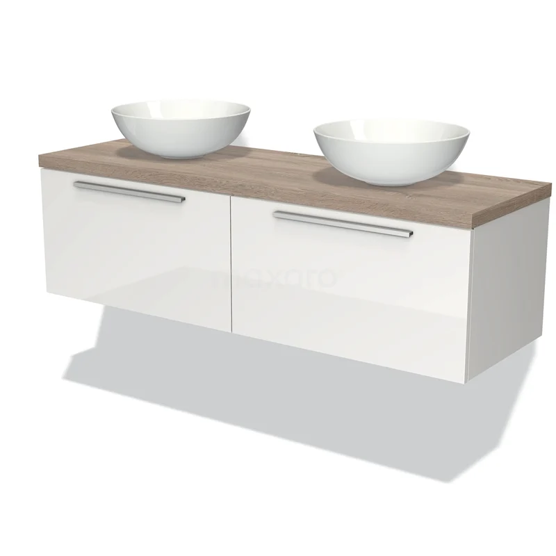 Modulo Plato Badmöbel mit Aufsatzwaschbecken | 140 cm Hochglanz Weiß Flach front Eiche blatt 2 nebeneinanderliegende Schubladen