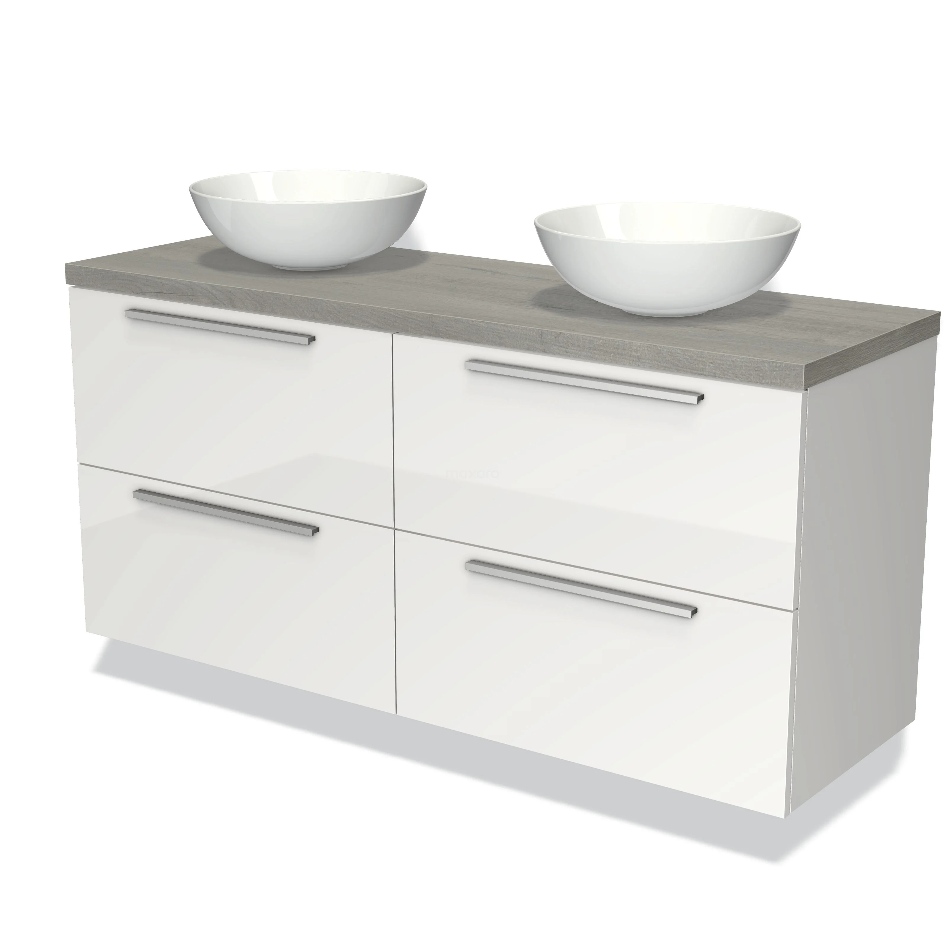 Weißen Badschrank mit doppelten Aufsatzwaschbecken, graue Holzplatte, 4 Schubladen und modernen Haltegriffen, ideal für stilvolle Bäder.