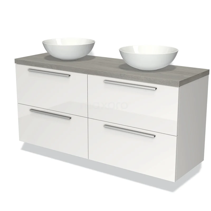 Modulo Plato Badmöbel mit Aufsatzwaschbecken | 140 cm Hochglanz Weiß Flach front Graue Eiche blatt 4 Schubladen