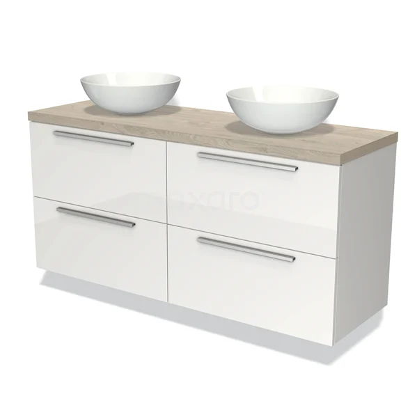 Modulo Plato Badmöbel mit Aufsatzwaschbecken | 140 cm Hochglanz Weiß Flach front Hellgraue Eiche blatt 4 Schubladen