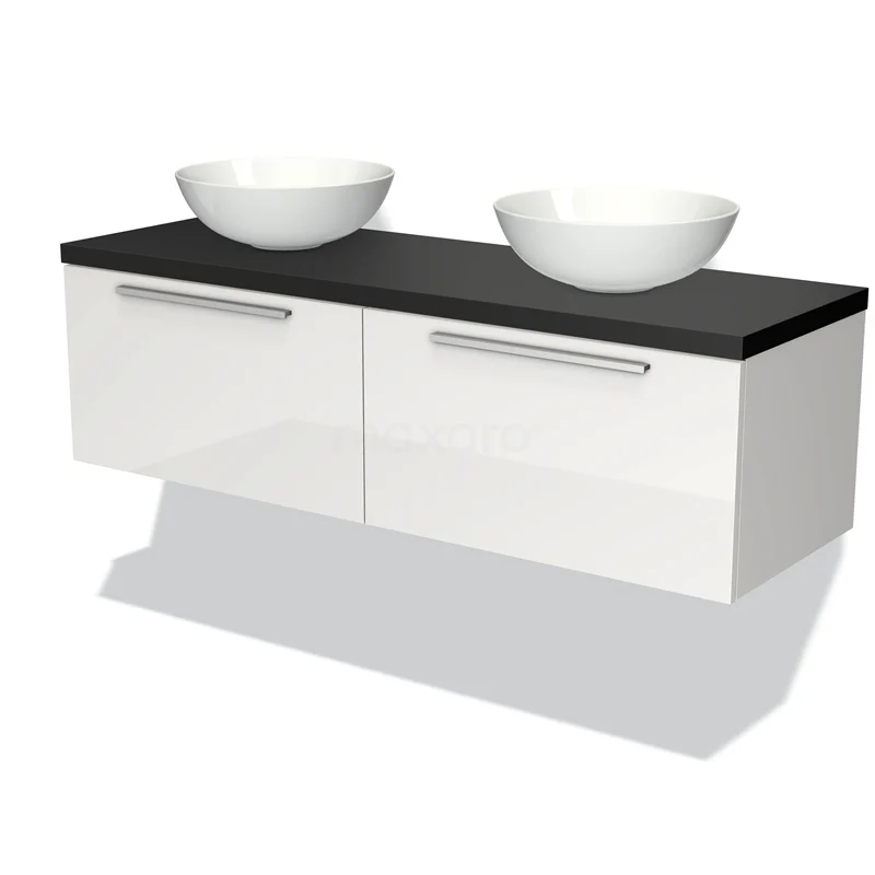 Modulo Plato Badmöbel mit Aufsatzwaschbecken | 140 cm Hochglanz Weiß Flach front Matt Schwarz blatt 2 nebeneinanderliegende Schubladen