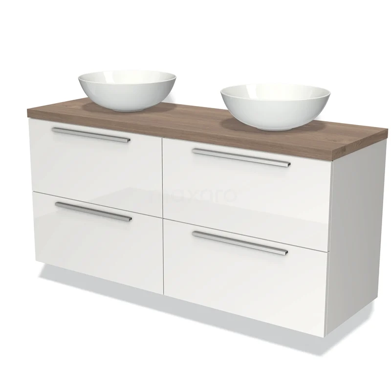 Modulo Plato Badmöbel mit Aufsatzwaschbecken | 140 cm Hochglanz Weiß Flach front Mittelbraune Eiche blatt 4 Schubladen