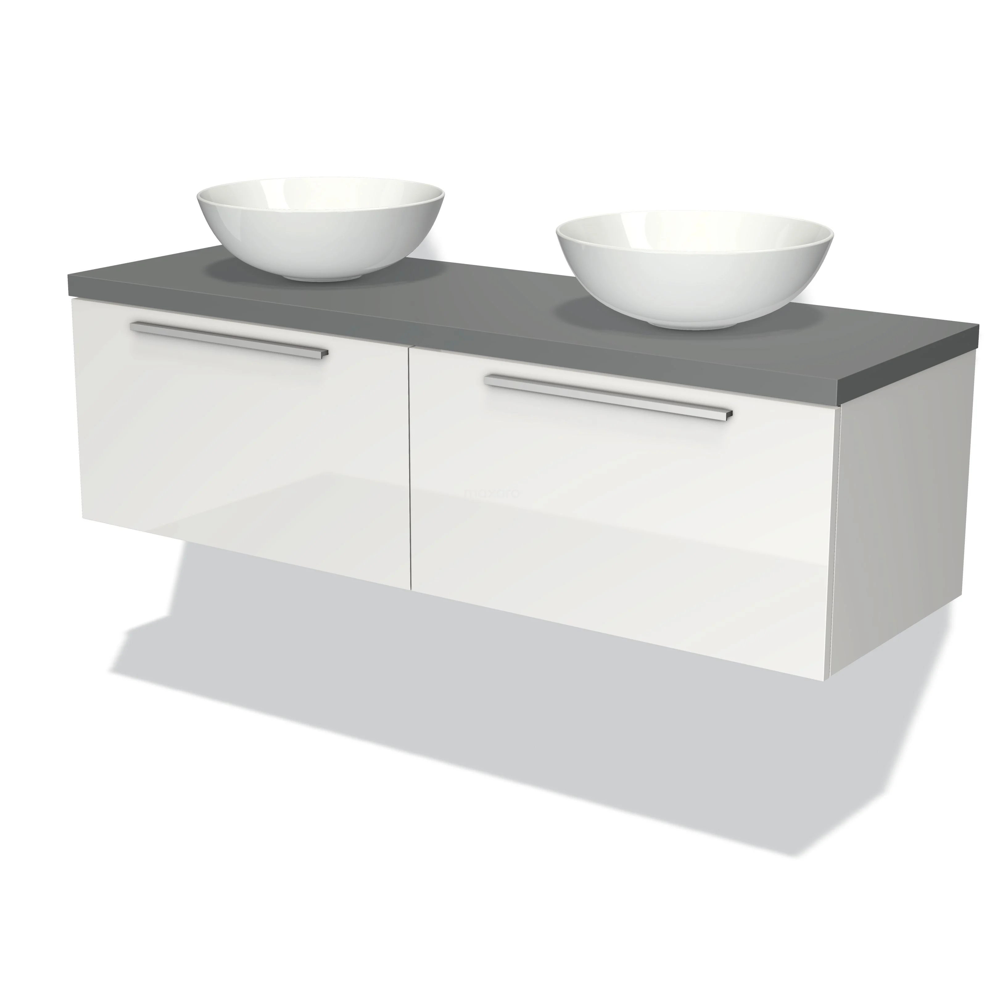 Modulo Plato Badmöbel mit Aufsatzwaschbecken | 140 cm Hochglanz Weiß Flach front Mittelgrau blatt 2 nebeneinanderliegende Schubladen