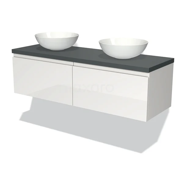 Modulo Plato Badmöbel mit Aufsatzwaschbecken | 140 cm Hochglanz Weiß Grifflos front Dunkelgrau blatt 2 nebeneinanderliegende Schubladen
