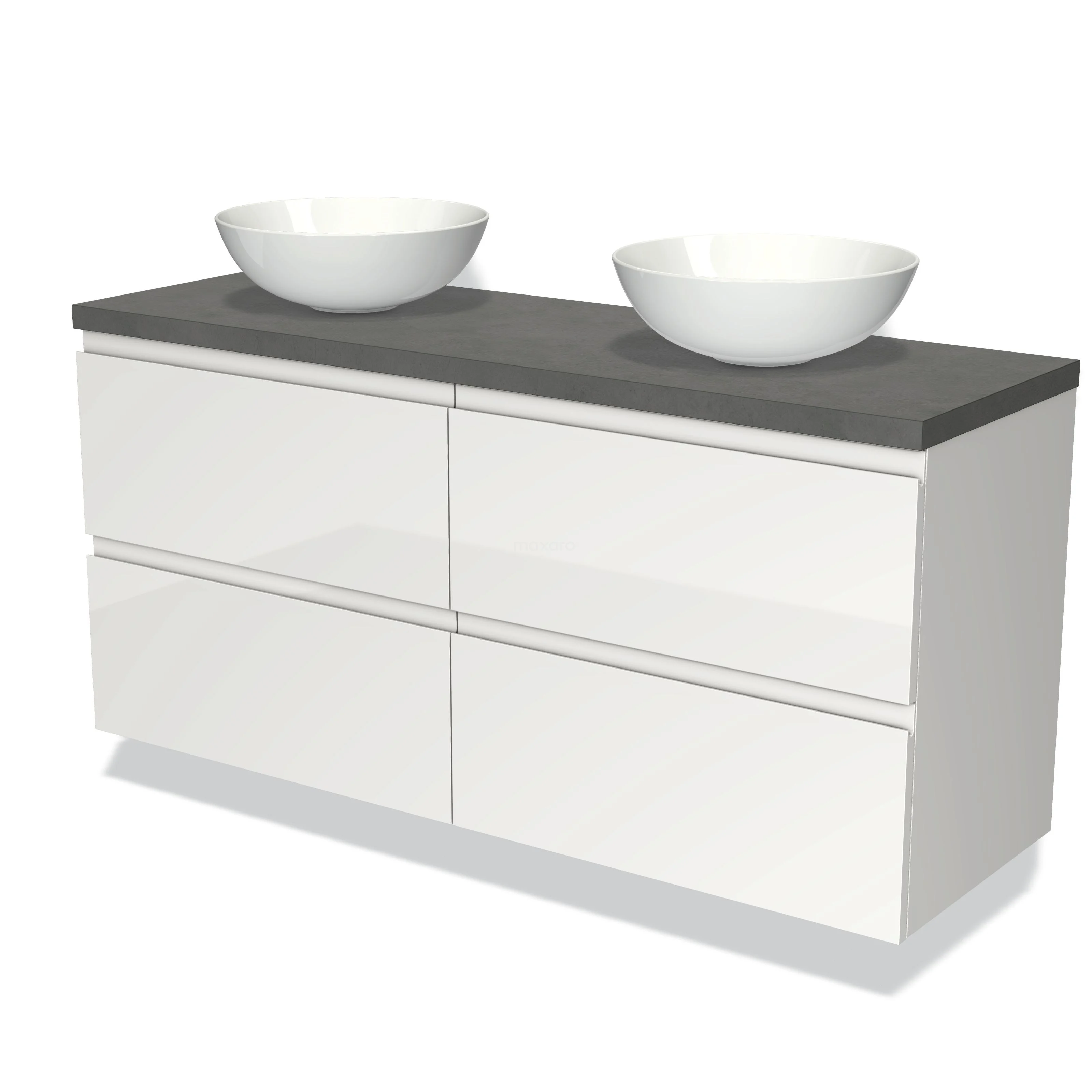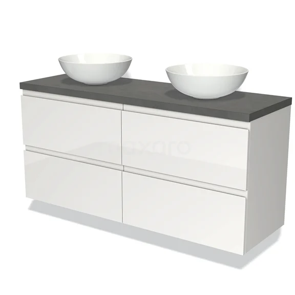 Modulo Plato Badmöbel mit Aufsatzwaschbecken | 140 cm Hochglanz Weiß Grifflos front Dunkelgrauer Beton blatt 4 Schubladen