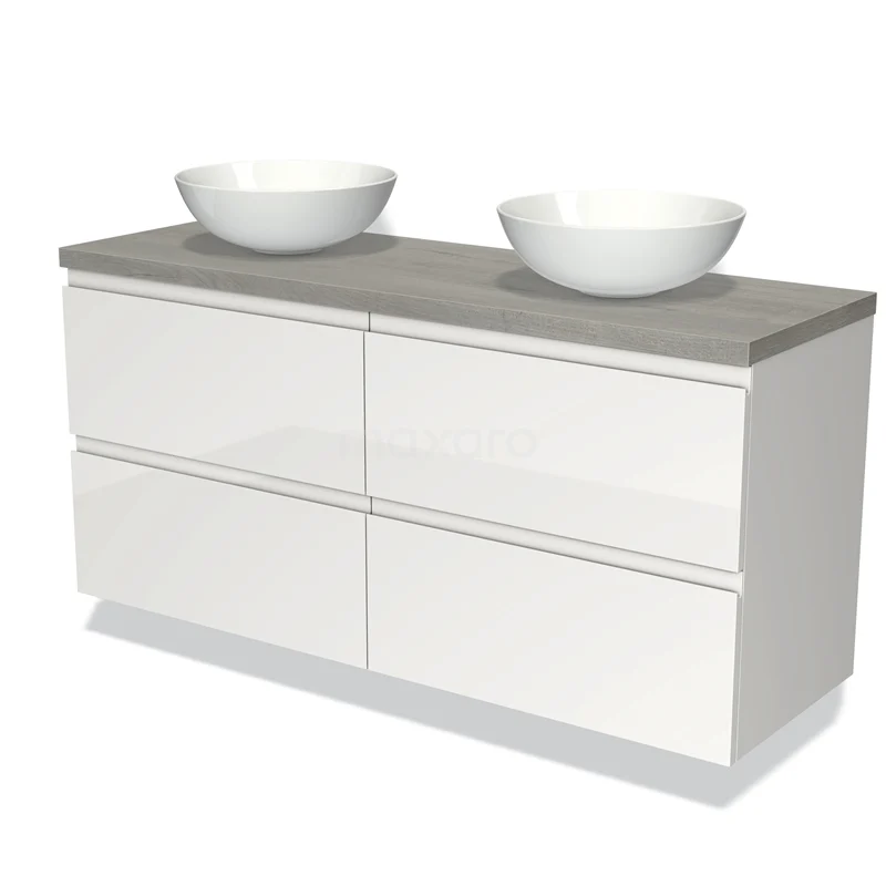 Modulo Plato Badmöbel mit Aufsatzwaschbecken | 140 cm Hochglanz Weiß Grifflos front Graue Eiche blatt 4 Schubladen