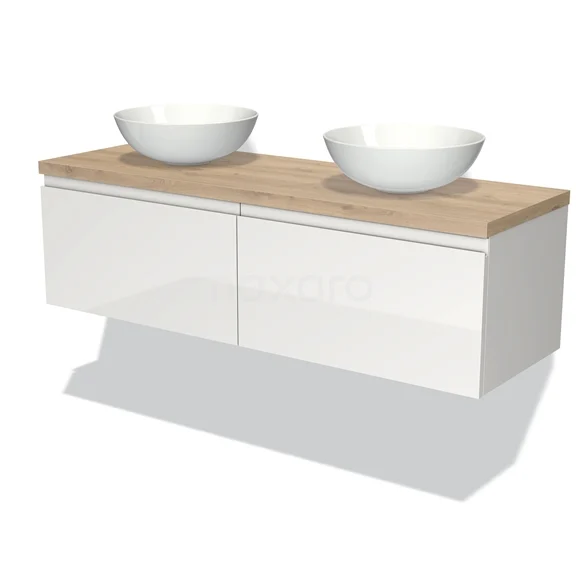 Modulo Plato Badmöbel mit Aufsatzwaschbecken | 140 cm Hochglanz Weiß Grifflos front Hellbraune Eiche blatt 2 nebeneinanderliegende Schubladen