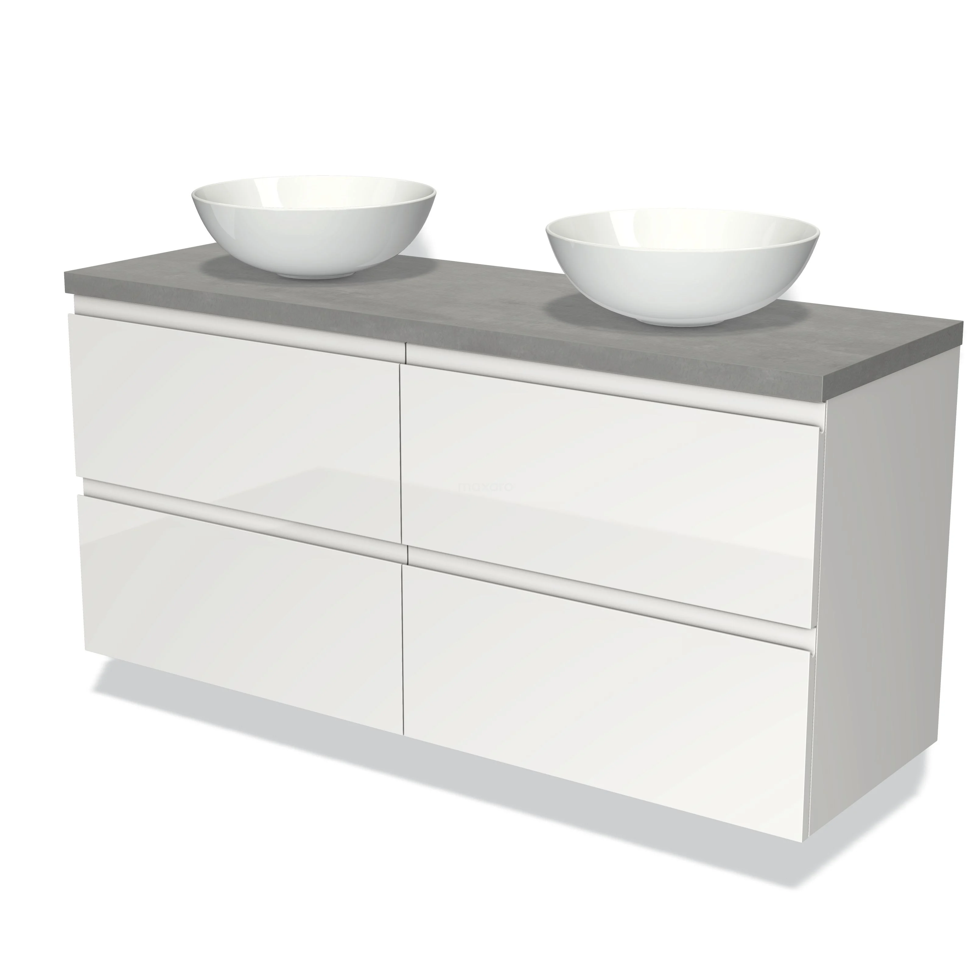 Modulo Plato Badmöbel mit Aufsatzwaschbecken | 140 cm Hochglanz Weiß Grifflos front Hellgrauer Beton blatt 4 Schubladen