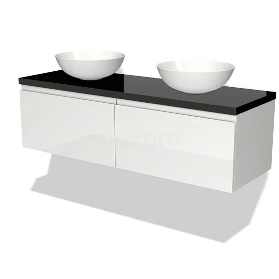 Modulo Plato Badmöbel mit Aufsatzwaschbecken | 140 cm Hochglanz Weiß Grifflos front Hochglanz Schwarz blatt 2 nebeneinanderliegende Schubladen