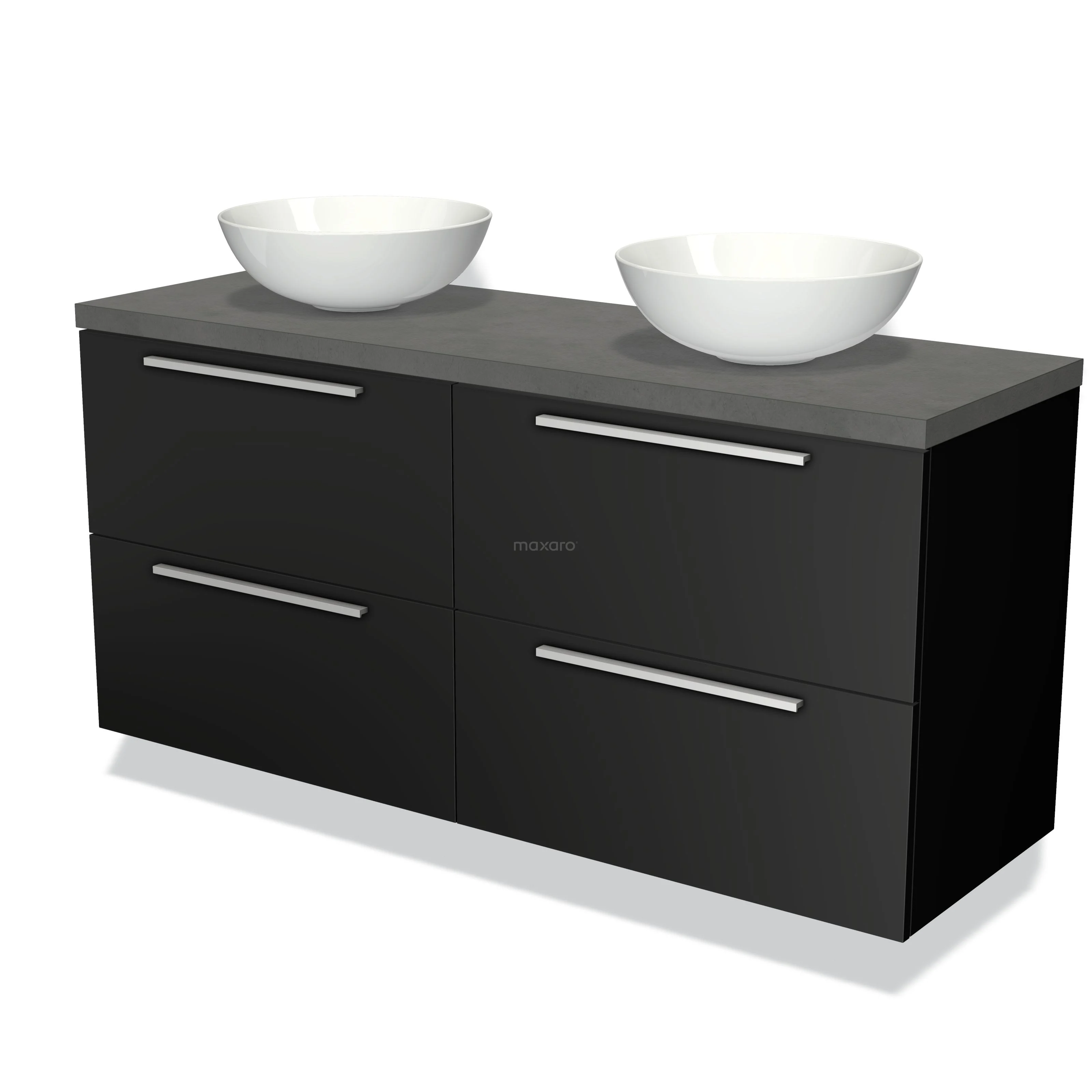 Modulo Plato Badmöbel mit Aufsatzwaschbecken | 140 cm Matt Schwarz Flach front Dunkelgrauer Beton blatt 4 Schubladen