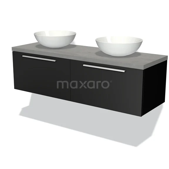 Modulo Plato Badmöbel mit Aufsatzwaschbecken | 140 cm Matt Schwarz Flach front Hellgrauer Beton blatt 2 nebeneinanderliegende Schubladen