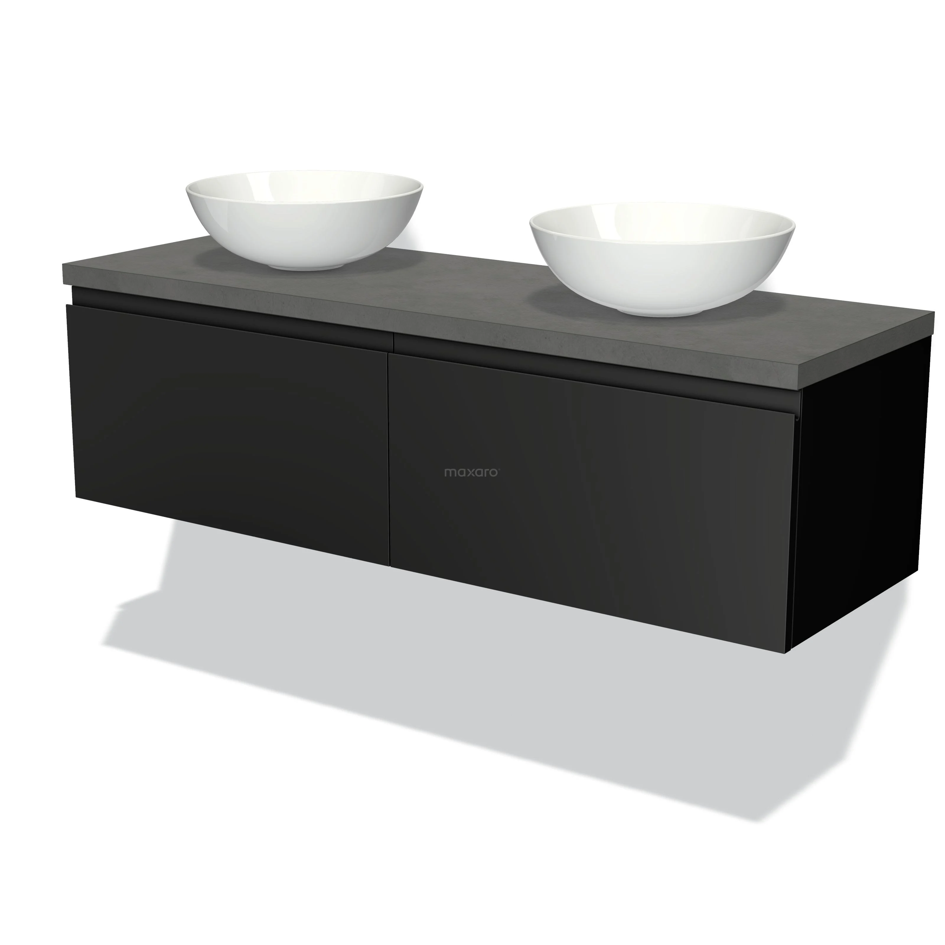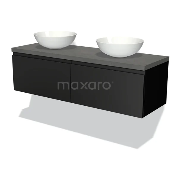 Modulo Plato Badmöbel mit Aufsatzwaschbecken | 140 cm Matt Schwarz Grifflos front Dunkelgrauer Beton blatt 2 nebeneinanderliegende Schubladen