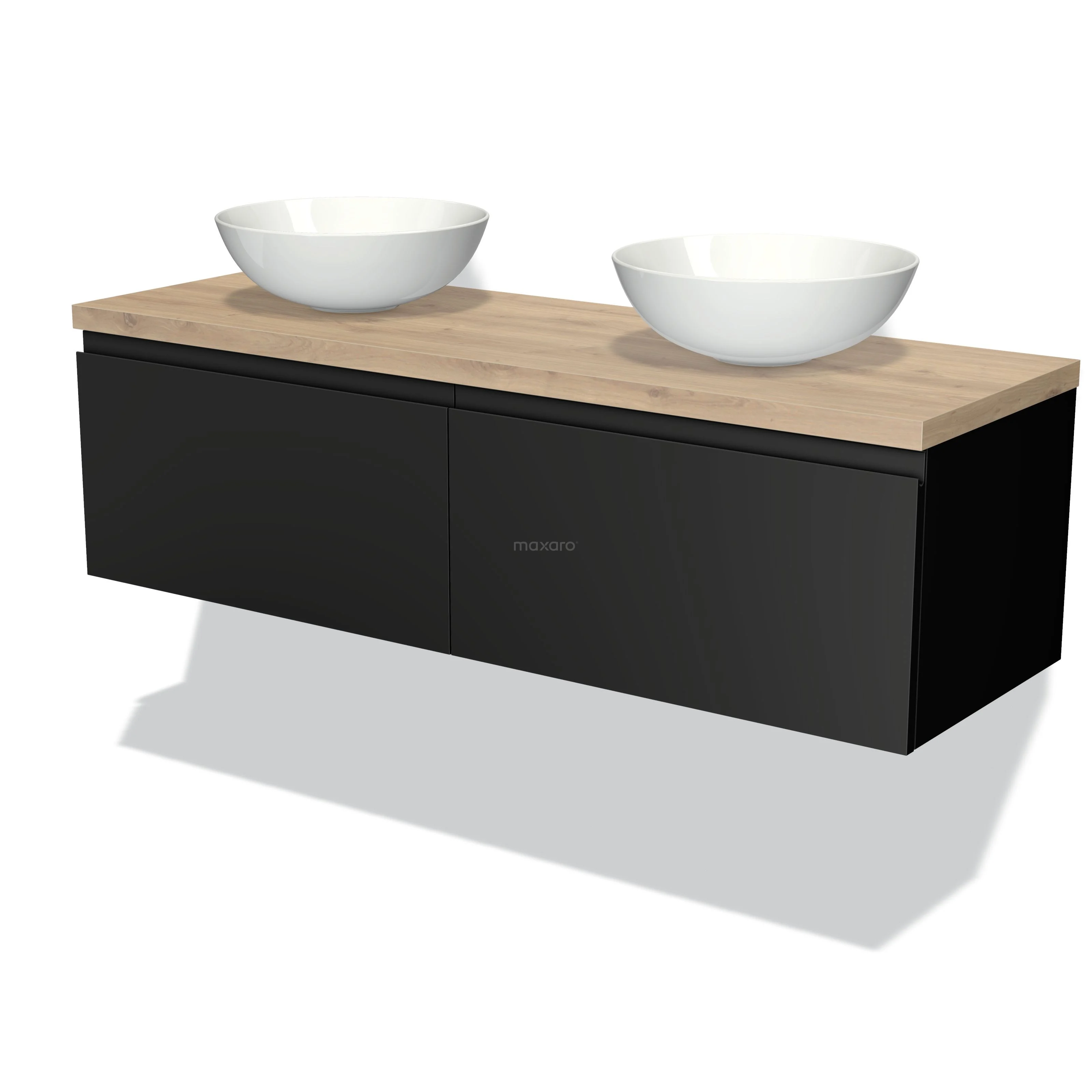 Modulo Plato Badmöbel mit Aufsatzwaschbecken | 140 cm Matt Schwarz Grifflos front Hellbraune Eiche blatt 2 nebeneinanderliegende Schubladen
