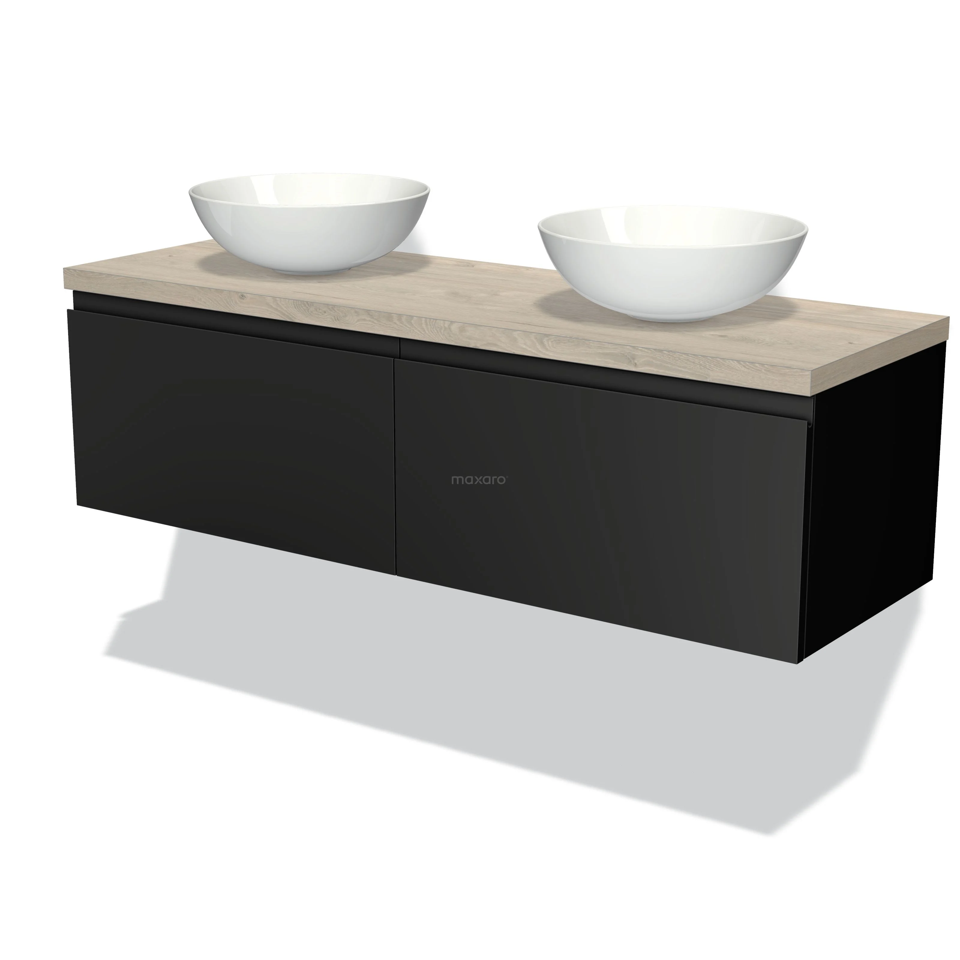 Modulo Plato Badmöbel mit Aufsatzwaschbecken | 140 cm Matt Schwarz Grifflos front Hellgraue Eiche blatt 2 nebeneinanderliegende Schubladen